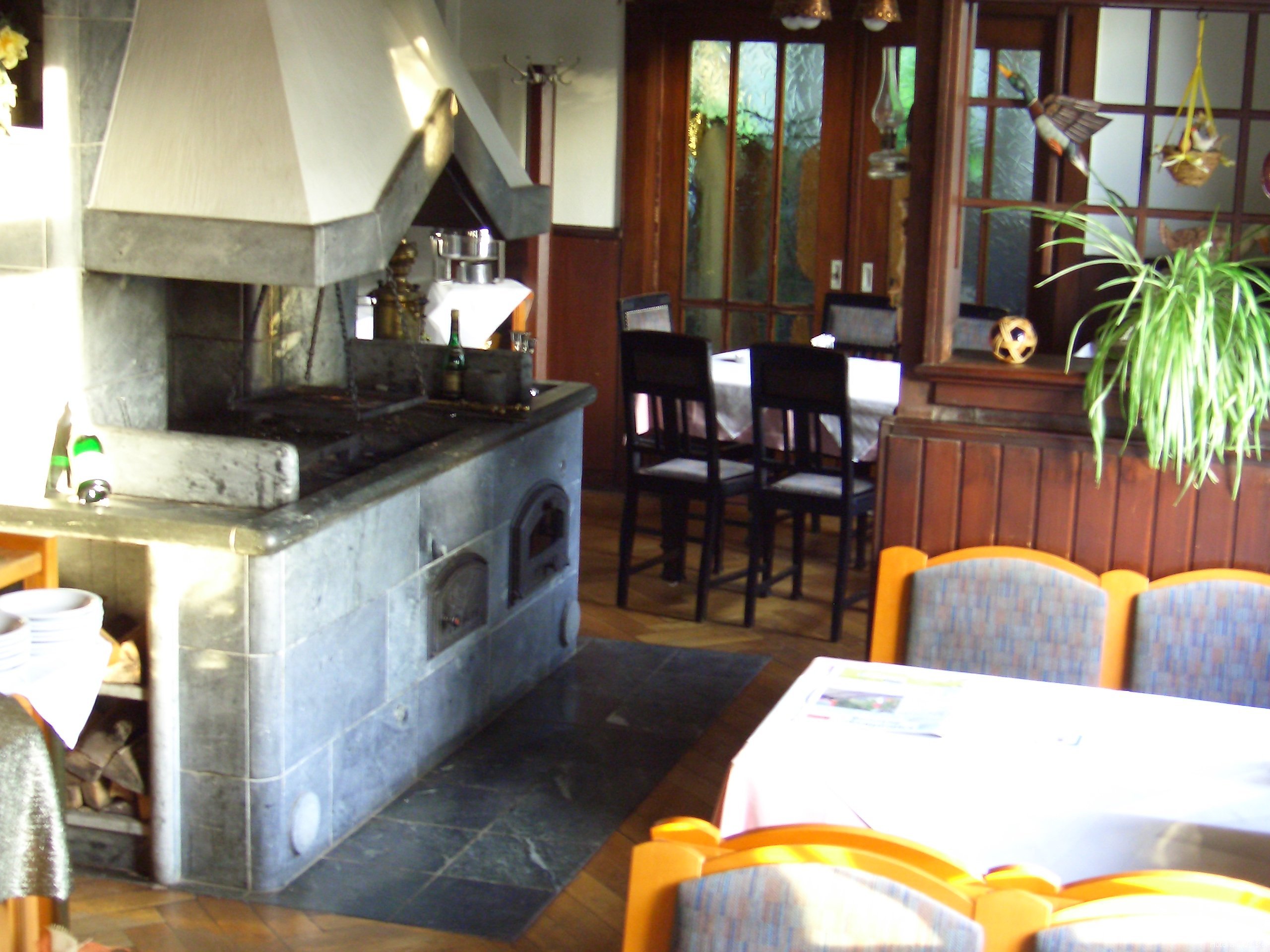 Mitten im Restaurant steht ein großer – aus Finnischem Speckstein gebauter Kaminofen mit offener Feuerstelle, über der auf dem Schwenkgrill jeden Abend, ( außer Montags ) die saftigen Steaks gegrillt werden.